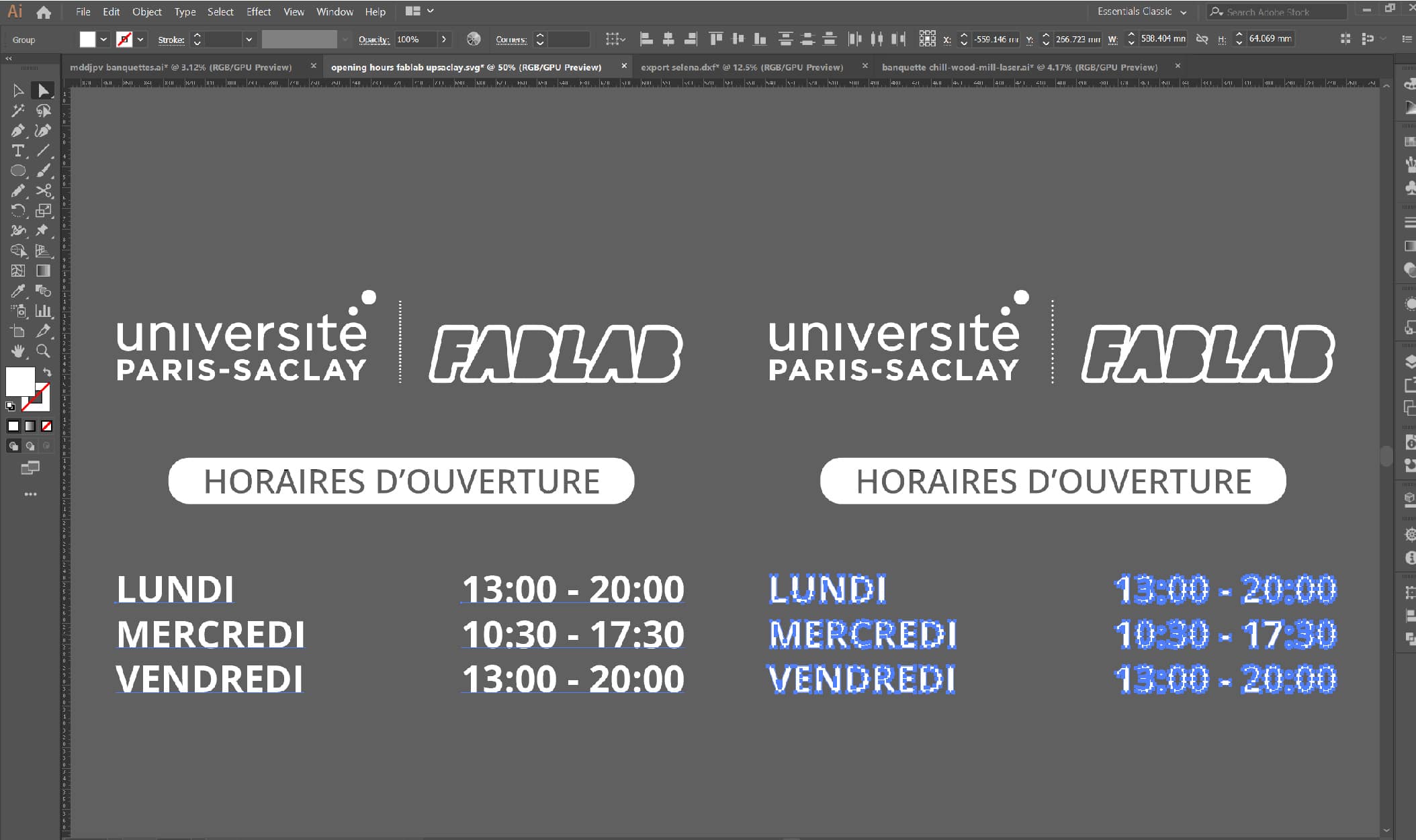 This week I decided to create a signage for the opening hours of the fablab new extension, in order to build a community of new users we need a better communication, it starts with sharing clearly our access modalities.