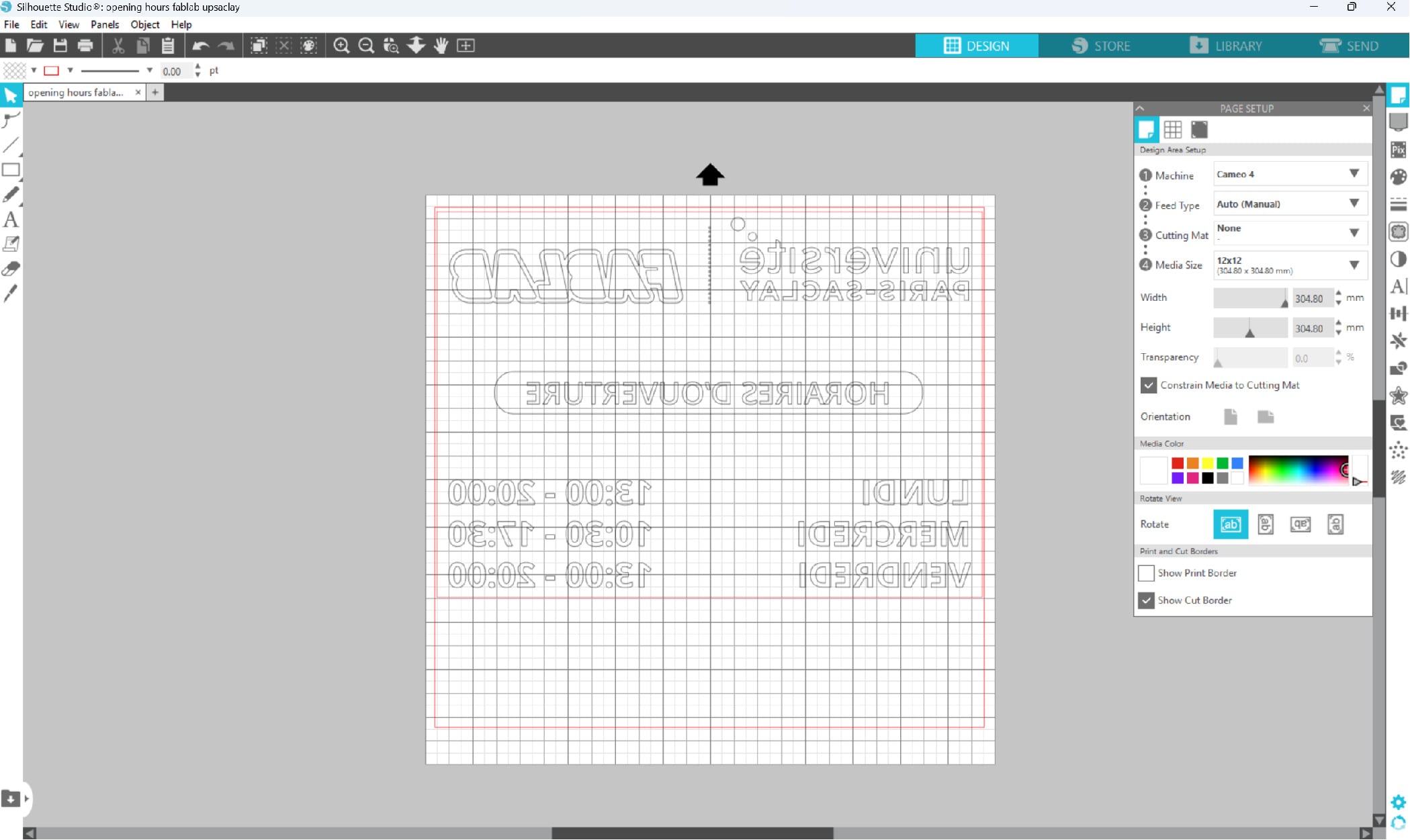 I have the Cameo Silhouette 4, so I use Silhouette Studio to launch my sticker project. What we are doing is creating instructions for the machine to cut our file on the vinyl sticker. In order to do so, we need to set some parameters in the Design interface, what is the size of our job, are we using or not a cutting mat, for instance.
