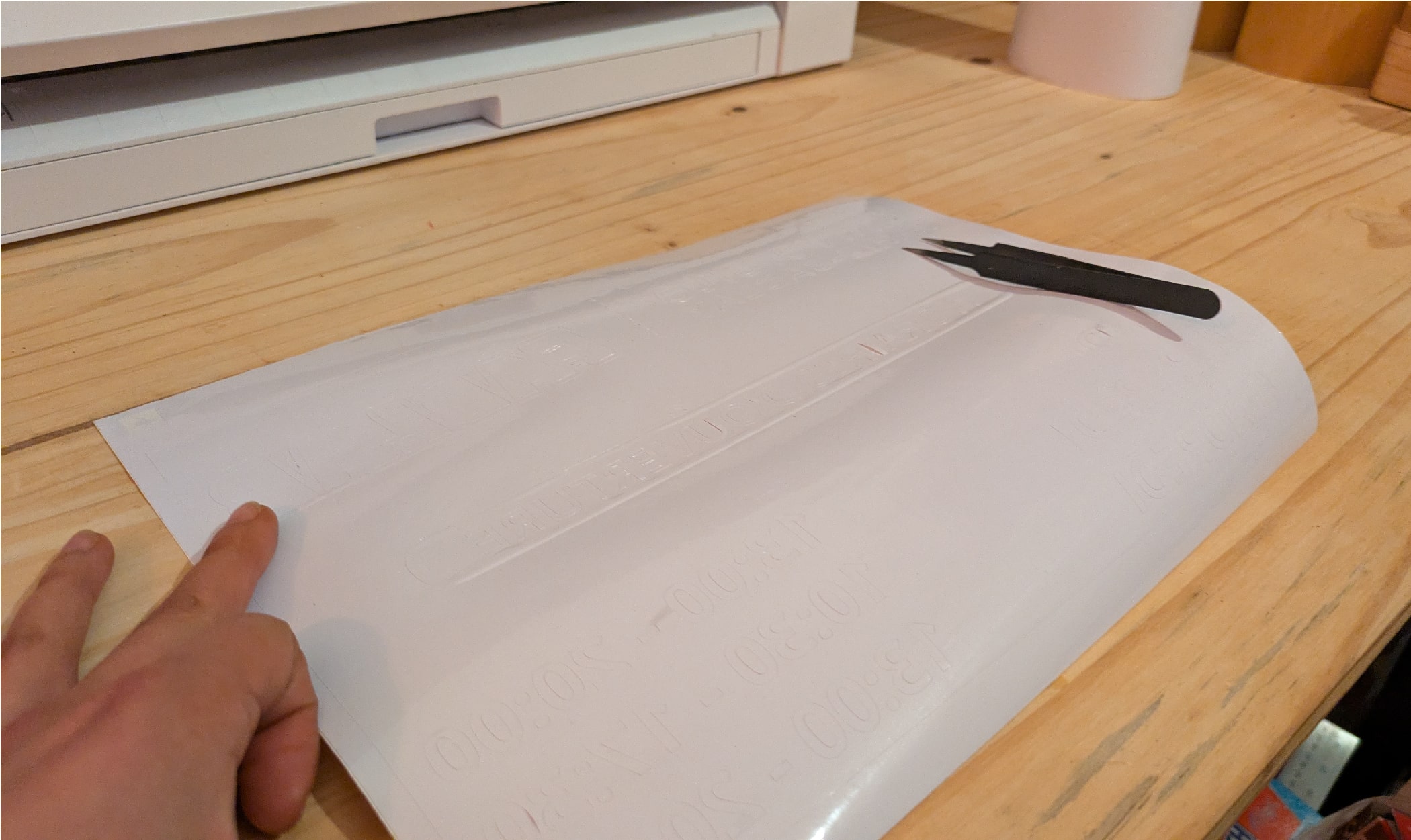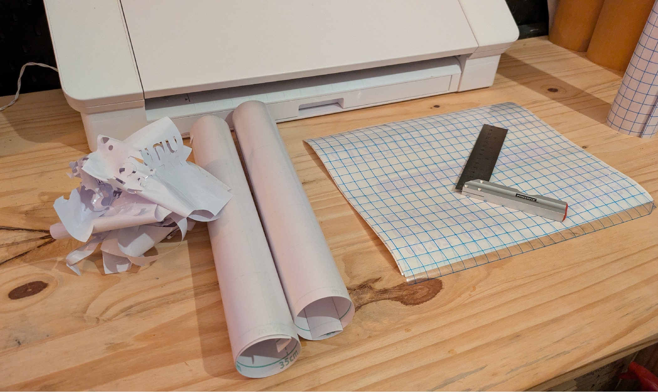 Final material, placed on a transfer sticker, ready to be stuck. And a pile of sticker waste, that I could have anticipated.