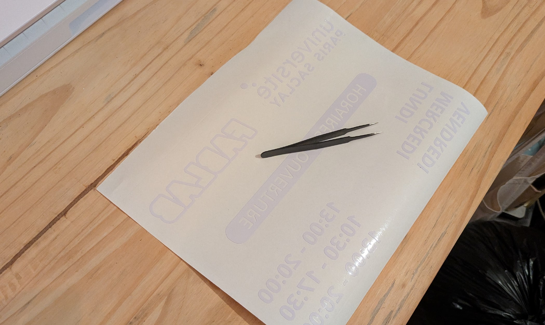 Finally, after cleaning the surface and taking some measurements to place it straight and in the center (I tried), I transferred it on our windows in the fablab.