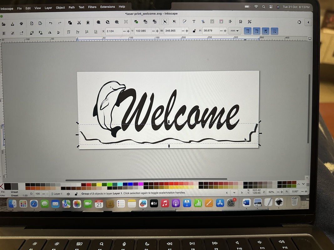 Preparing the design for laser printing was not easy, as the drawing required careful adjustments to ensure accurate results. The lines of the dolphin had to be properly connected so that only the intended parts were rastered; otherwise, the entire body of the dolphin might be rastered unintentionally. Letters such as “e” and “o” also required extra attention, as their inner spaces needed to be preserved. This involved ungrouping, combining, or breaking apart text elements to create the correct cut-out inlets and avoid unwanted rastering. Numerous corrections and fine-tuning were necessary to achieve a clean and precise design. Additionally, I learned that different laser printers and software may have varying procedures, such as specific color codes, line thickness settings, or file formats. Therefore, it is important to understand the particular requirements of each machine before finalizing a file for laser cutting or engraving.