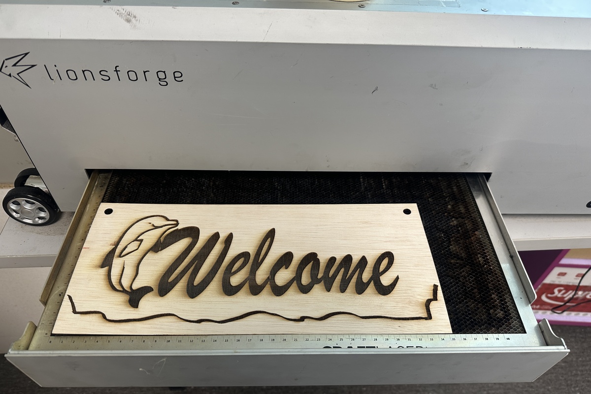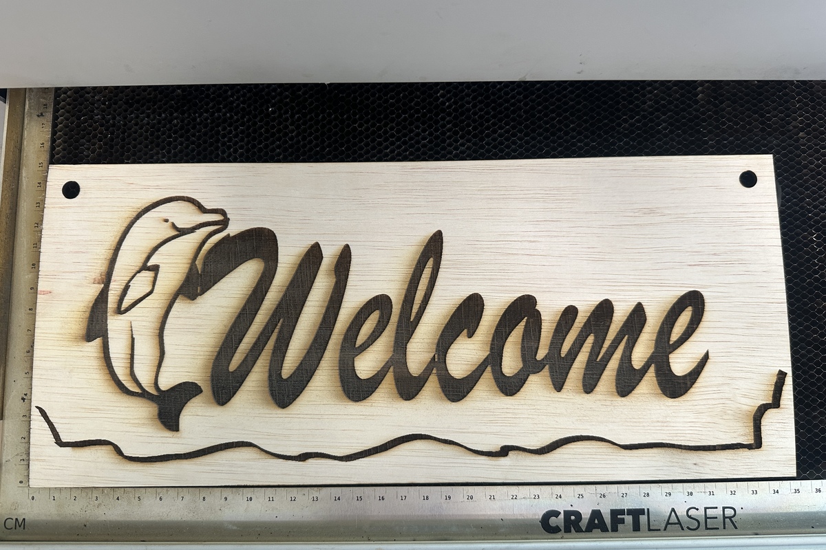 Create a laser-cut and rastered “Welcome ” sign featuring a dolphin graphic, suitable for classroom or school display.