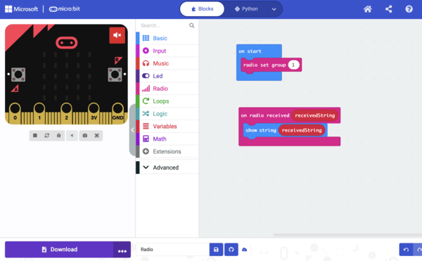 π₯ Step 3: When Message Received π From Radio, drag: on radio received string π From Basic, drag: Show string Place inside on radio received string block