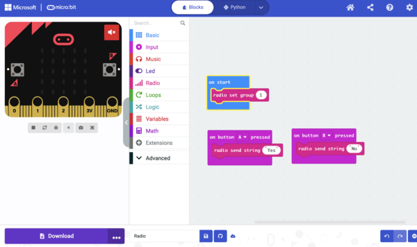 π Step 3: Send Message on Button A πFrom Input, drag: π Drag: on button A pressed π From Radio, drag: radio send string ‘Yes’ Place inside button A block.