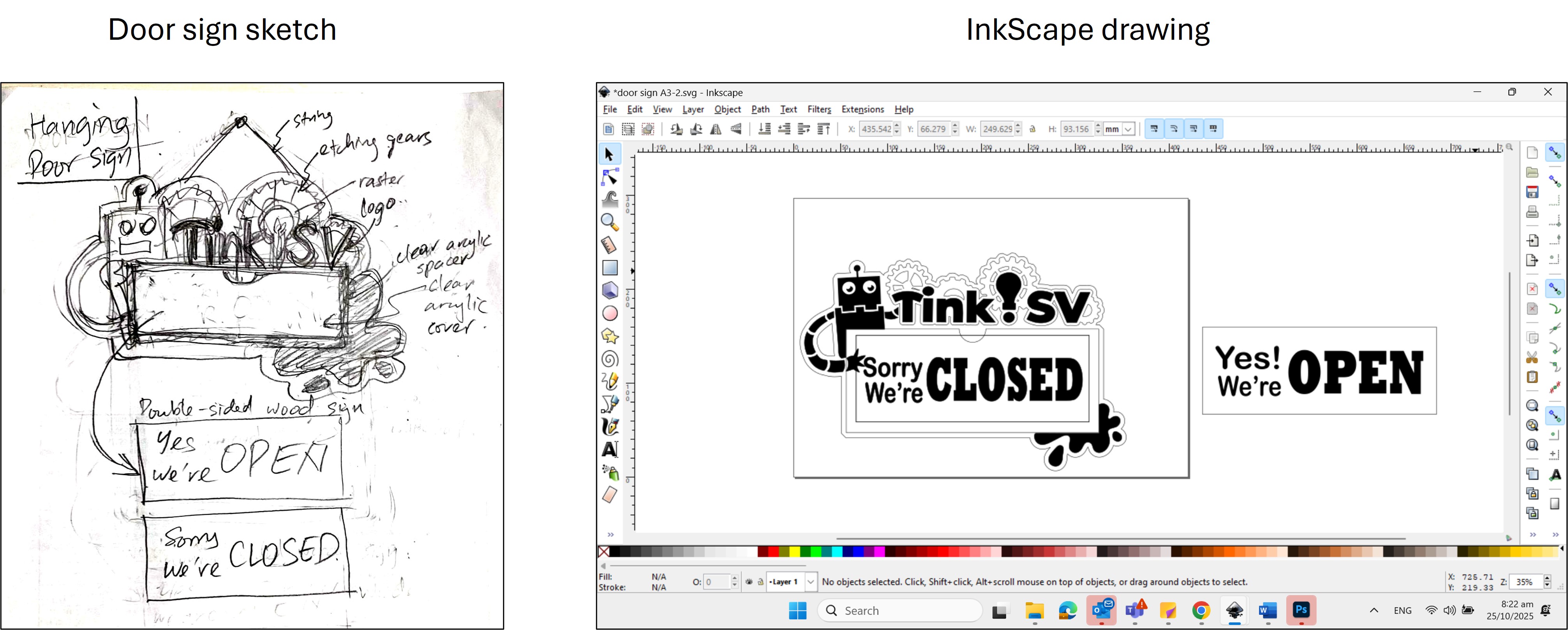 Steps: 1) Design and sketch the door sign on paper. Open InkScape and create a 2D design of a door signage to be laser cut. Export into SVG format.