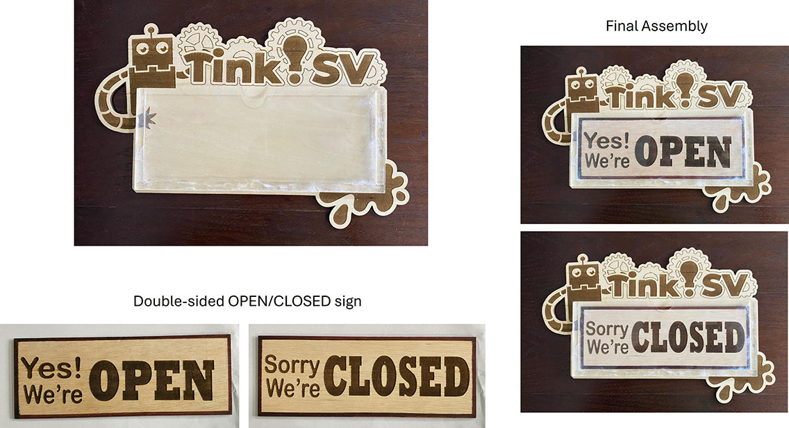 For the OPEN/CLOSED sign, I can combine electronic cutting and laser cutting process. i.e. to cut the sign using acrylic panel and the words using vinyl stickers.