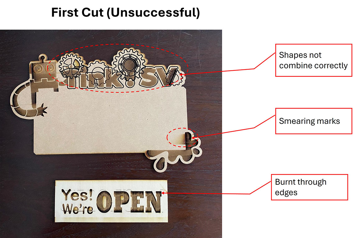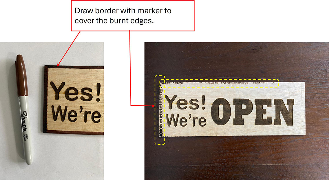 The 2nd OPEN/CLOSED sign was successfully done, but because of the doubled-side rasterization, the edge of the wood was burnt on the second side. Instead of redoing a new piece, I decided to draw a border using a Sharpie marker to cover the burnt marks.