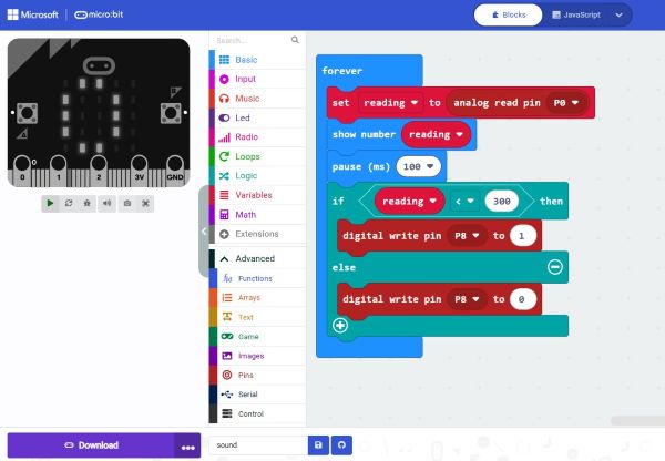 Next, I connected an LED to digital pin 8 and wrote a conditional programme on MakeCode. I set the LED to turn on when the light value dropped below 300 and turn off when the value was above 300. After several rounds of testing and adjusting the threshold value, the system responded accurately to changes in lighting.