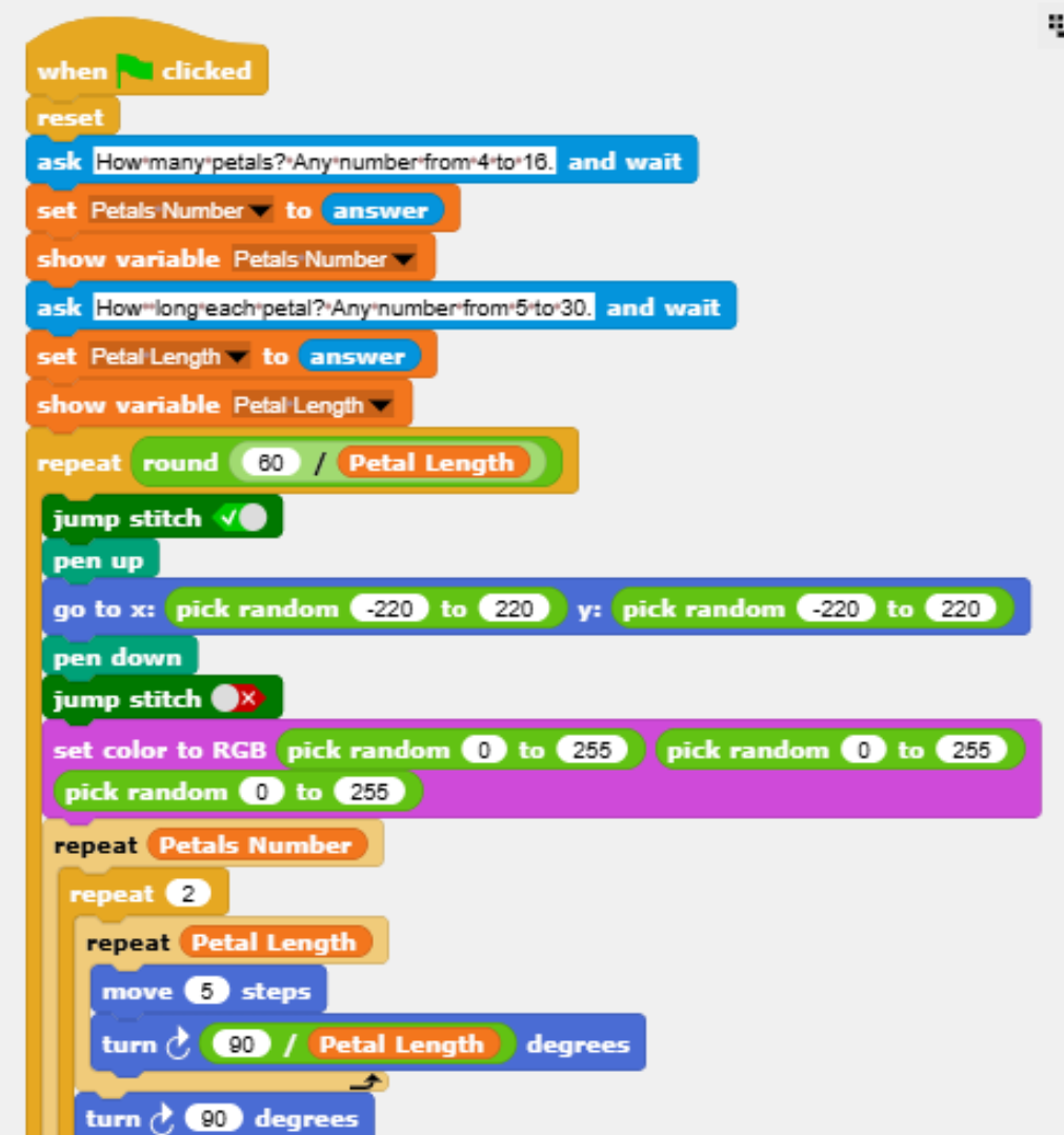 Design and implement an activity using a block programming language. Students will interact with the programme and try ot understand the code and work in pairs to improve on the code to create a design where the flowers generated will not overlap with each other.