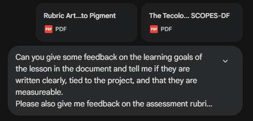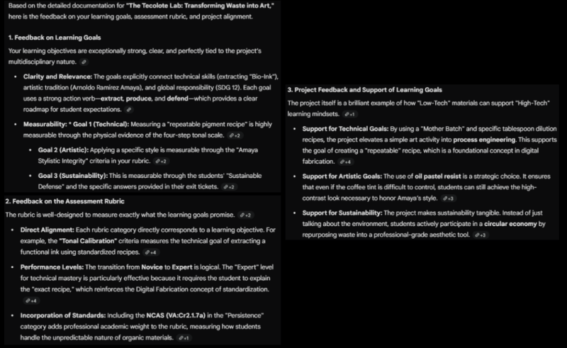 What was the specific feedback about how the project aligns with learning goals? How does the assessment align with the learning goals? Does the assessment protocol make sense within the lesson (ie. type of assessment, pacing, difficulty of implementing) Gemini tells that the learning goals are measurable through the evaluation provided (the reading questions, the rubric and final students’ reflection), on the specific learning goals for sustainability, and artistic standards.