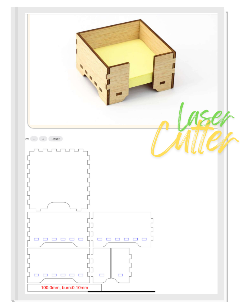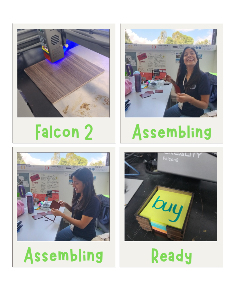 Initially, we had to program the cutter four times to successfully cut the box components. After assembling the pieces, we found that they did not fit together properly. We then reattempted the process using the “Falcon 2” machine, which achieved a perfect cut. However, we discovered that the design itself was not entirely accurate, as some parts overlapped and did not fit as intended. To resolve this, we adjusted the dimensions of the assembly holes, used a small handheld drill to remove excess material, and sanded the surfaces to obtain a clean and polished finish.