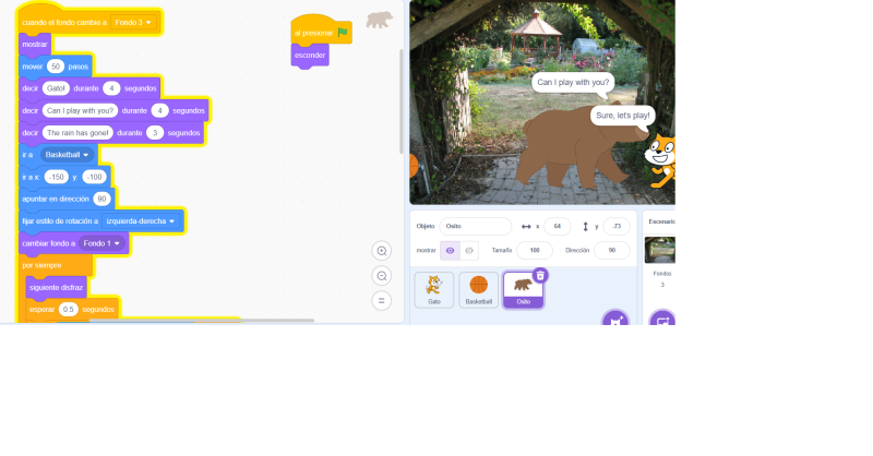 It is about the character Cat being happy because it is not rainy anymore so he can play basket ball, he can’t find his ball, so the users need to help him once they find the ball they meet with Bear who wants to join in the game.
