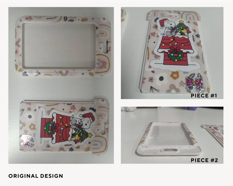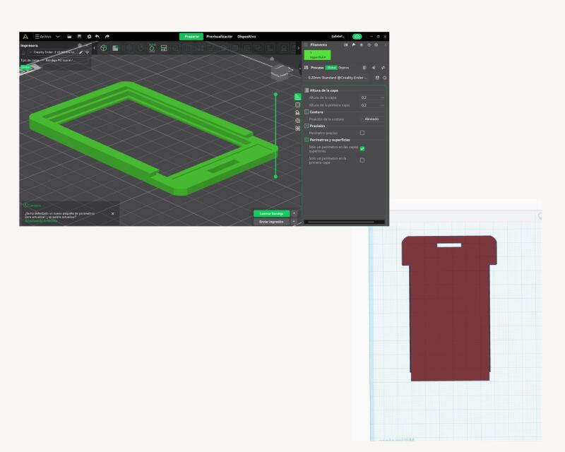 - Steps followed: The design was developed using the Tinkercad software, based on the dimensions of an existing ID card holder. The process began with the modeling of the first component, which incorporates a tab designed to be inserted into the second component. Starting from a cubic base geometry, the dimensions were carefully adjusted to replicate the original object as accurately as possible.