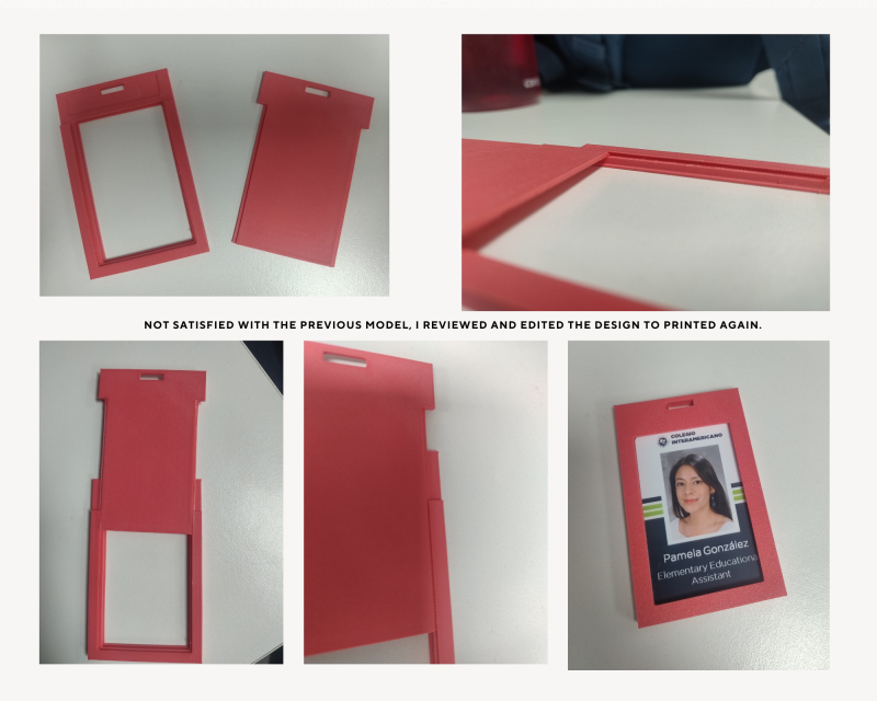Challenges and solutions One of the greatest challenges for me was editing the piece number two, as it needed to include a space for the identification card as well as the area where piece number one fits perfectly without getting stuck. I conducted several tests to achieve this, until it was finally successful. I also engraved the name Fablab, giving it a personalized touch.
