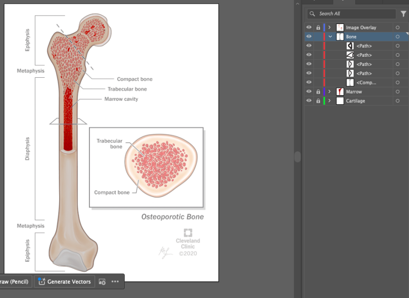 I traced the shape of a femur in Illustrator, creating separate layers for marrow and cartilage, and then I set to creating a trabecular pattern inside of the ‘spongy’ layer of internal bone. This was… tedious.