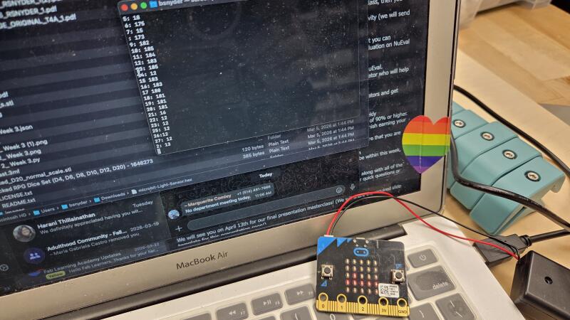 This week, I decided to focus on potential ideas for FA4. One idea that I had was an interdisciplinary lesson about the effects of salinity on water’s ability to refract and reflect light, which ties into the Physics topic of Optics as well as Environmental Systems Sciences topics relating to ocean life. To accomplish this, I set out to design a simple light sensor for measuring how the amplitude of a light wave changes as it is refracted through salt water as compared to its initial brightness value. micro:bits are equipped with a simple LED screen which can be reversed to detect incoming light, so they seemed to be an ideal candidate for this task. Additionally, micro:bits’ radio functionality and ease of connection to a computer to transmit data would allow the sensor to be simple and handheld while another micro:bit records the data in the computer terminal.