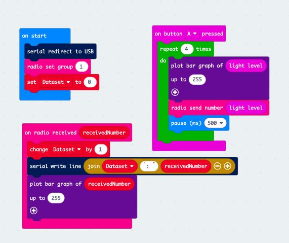 I used a simple block code for this function. The start code initialises the radio control, serial bus, and counter variable, then the system idles until one of two things occur. This allows the same code to be used for either the transmitter or the receiver micro:bit.