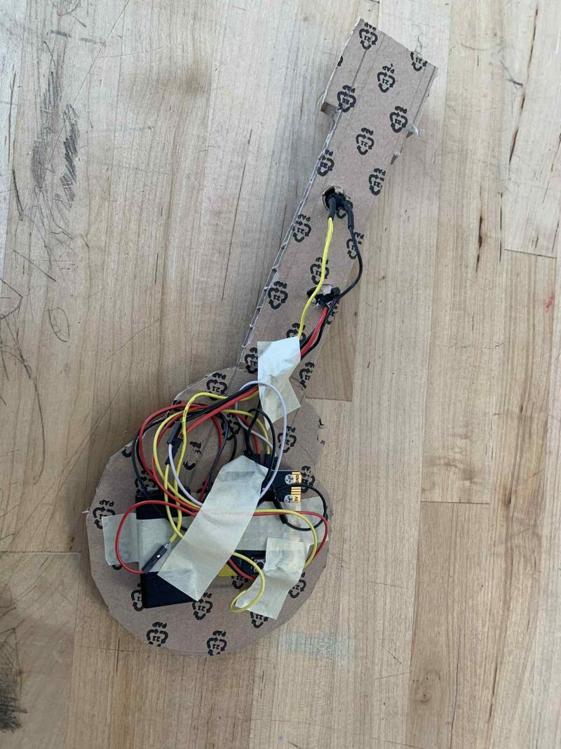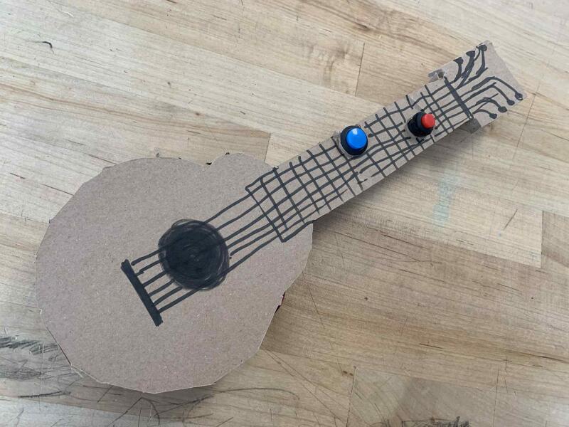 I designed and built the cardboard guitar, installing the buttons on the fretboard.