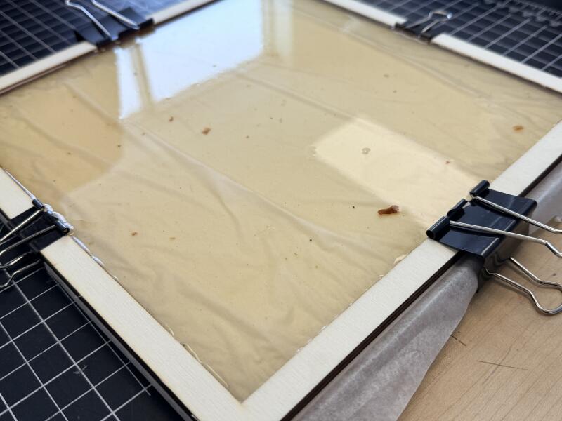 Additional Reflections 1. Several key lessons emerged from this process: 2. When pouring the liquid into the mold, it is important to place the mold in its final position first. Pouring the mixture and then moving the mold caused the liquid to spill and spread unevenly. 3. Working on a level surface is essential for producing consistent bioplastic. As seen in the images, thinner areas resulted in weaker material that cracked during the hardening process. 4. Over time, the mold began to warp. This was likely due to the wood not being thick enough, or because the clamps were not left in place long enough to maintain the mold’s shape.