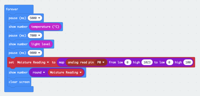 The system operates as a “set-and-forget” device, storing readings in the Micro:bit’s memory. When buttons A, B, or A+B are pressed, the device transmits the stored light level, soil moisture, and ambient temperature data respectively to a receiving Micro:bit, which then displays the collected hourly information. This approach allows data to be retrieved at any time after setup without needing the receiver to remain continuously connected.