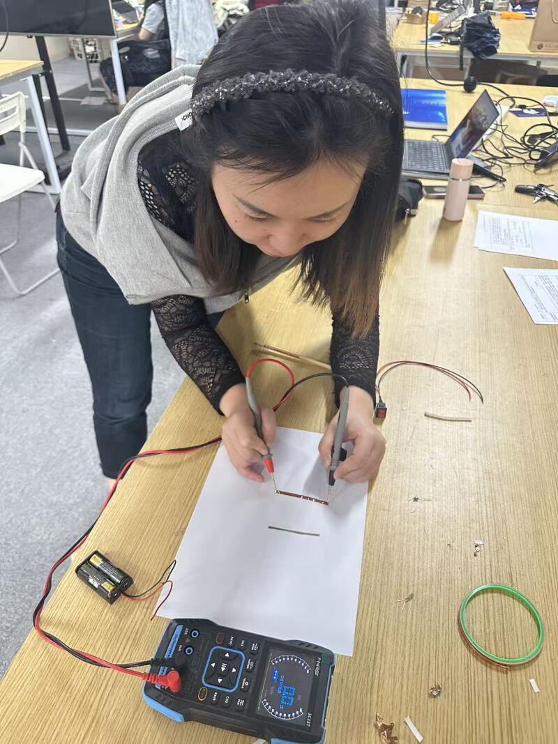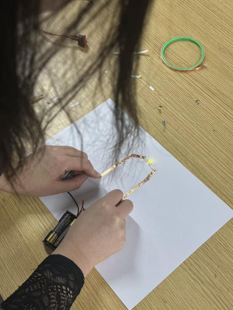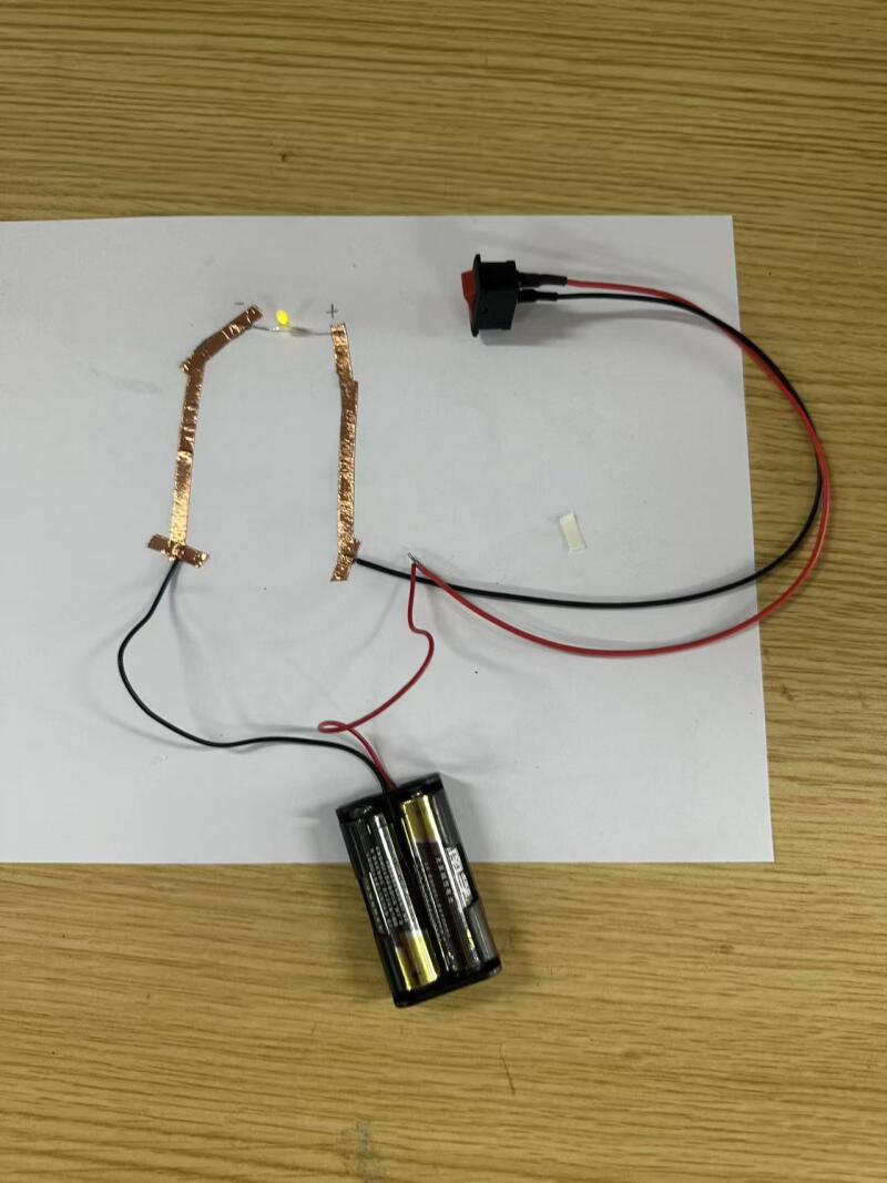 Draw conductive lines on the paper with a pencil, then stick on the copper foil. Align them with the positive and negative poles of the small light to make sure a closed circuit is formed.Then use a multimeter to check if the circuit is powered on.