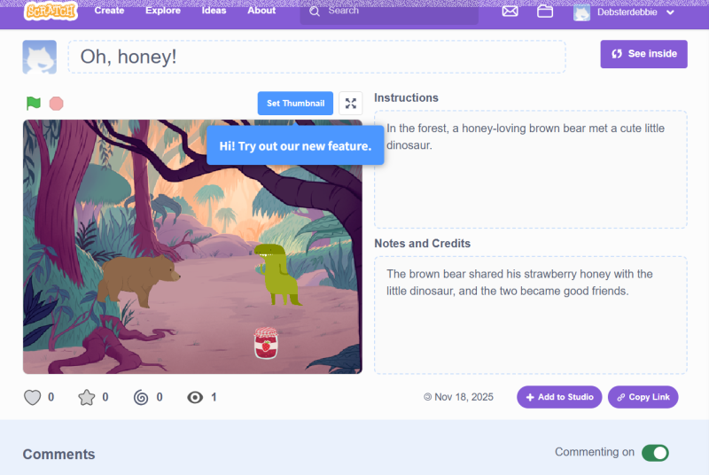 Key learnings I realized that even a simple story requires attention to small details. Especially when I was trying to have a conversation between two characters, I experimented with recording audio myself, inserting it as sound commands, and also recording the sounds of animals eating food together with my child. The entire process was very enjoyable.