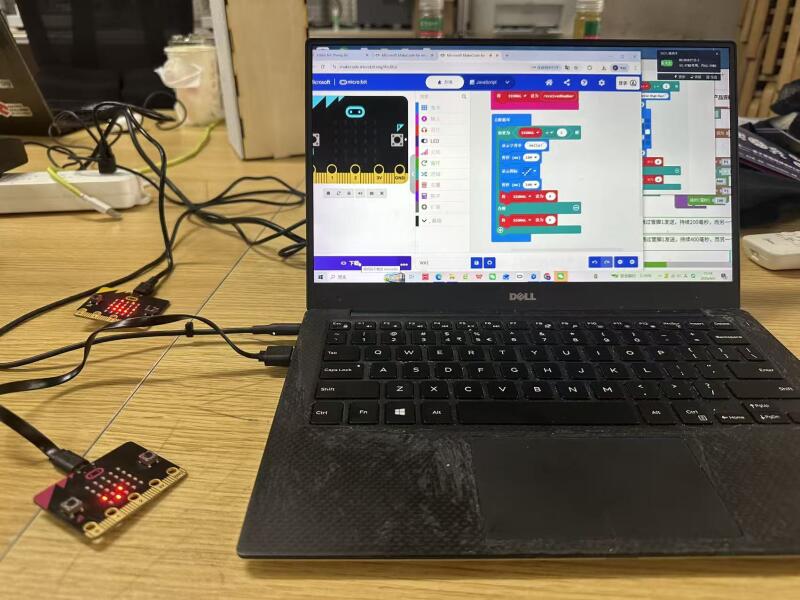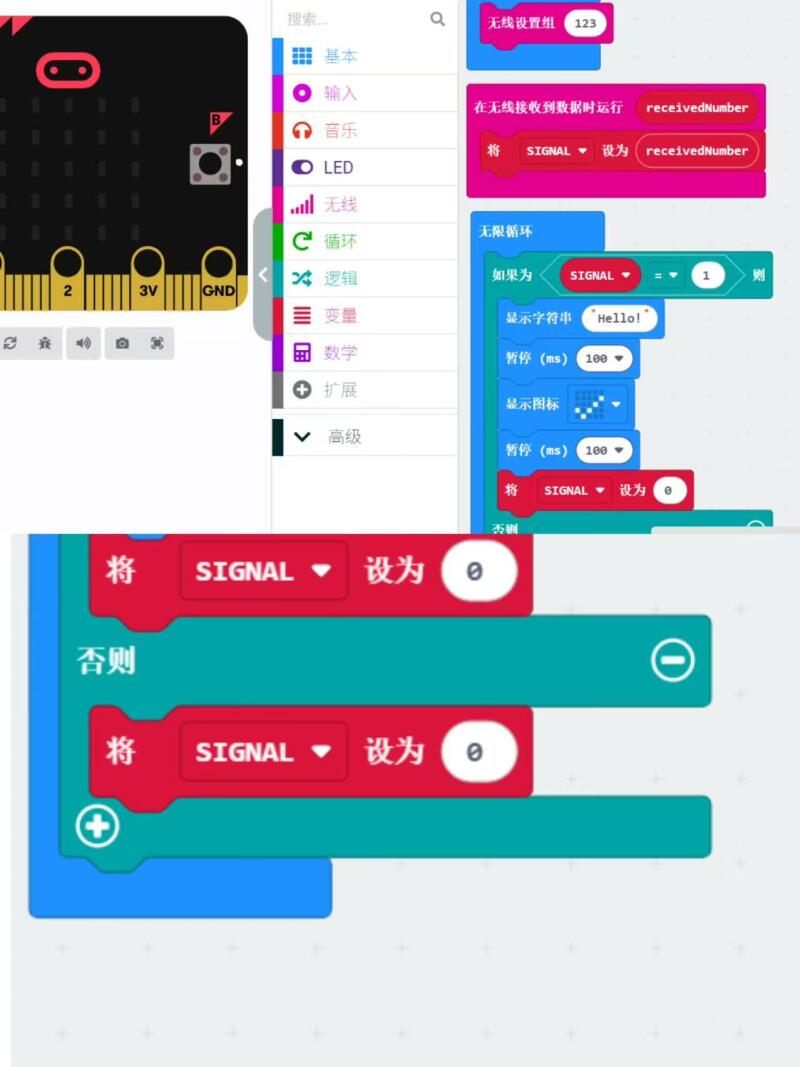 This enables communication between the main board and the secondary board. When Button A on the main board is pressed, the secondary board displays “HELLO”, pauses for 1 second, and then shows a checkmark icon.