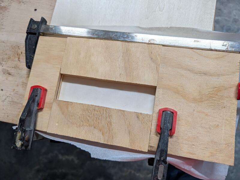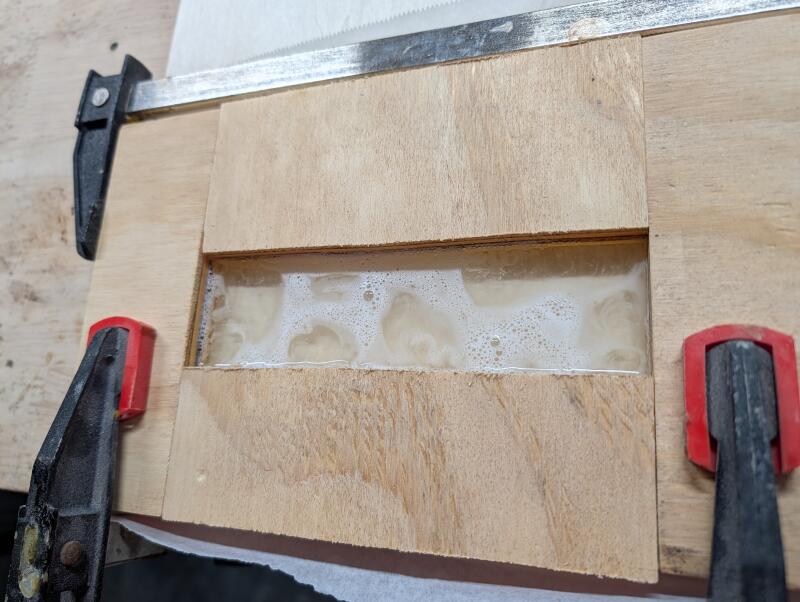 - I created a simple mold for a long, thing piece of bioplastic to engrave. I made it with cut wood, parchment paper and some clamps.